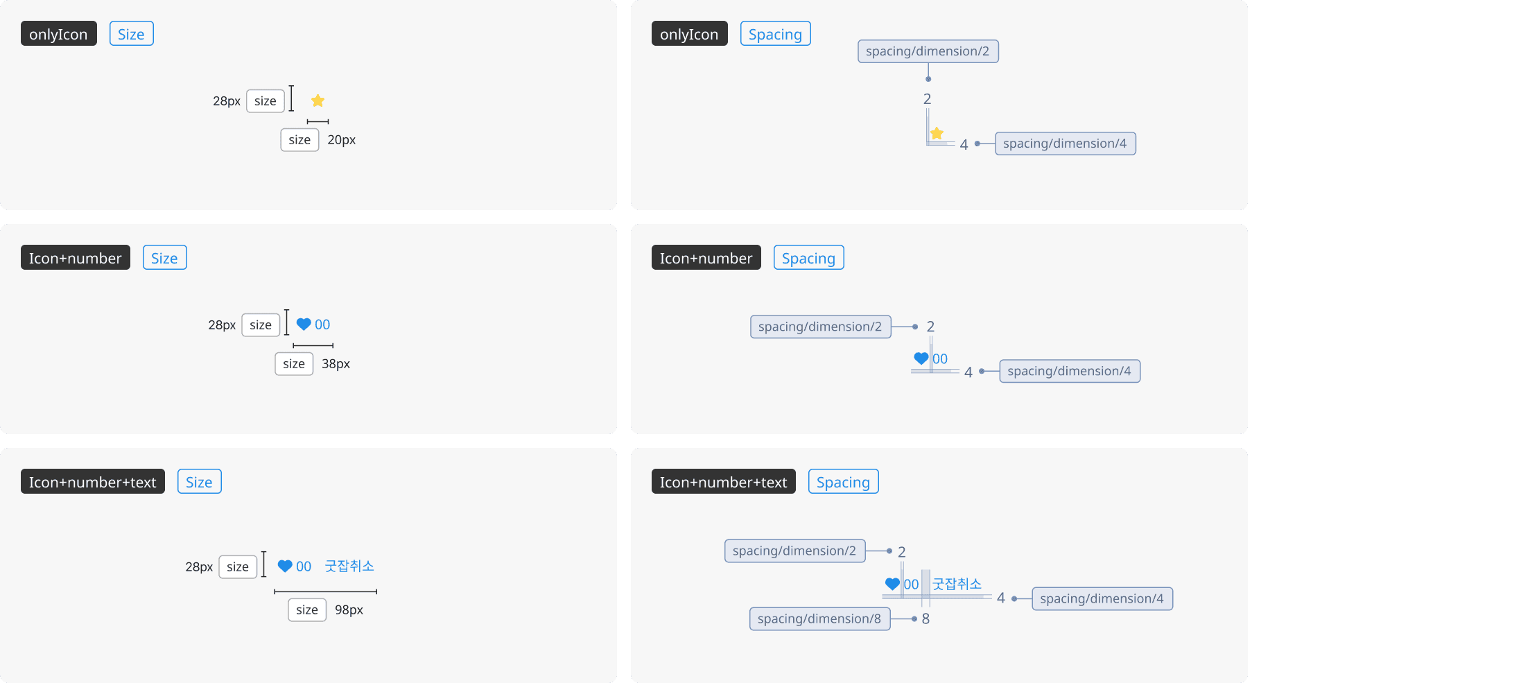 Reaction Button의 사이즈는 icon+text 타입과 onlyIcon 타입에 따라 구분됩니다.