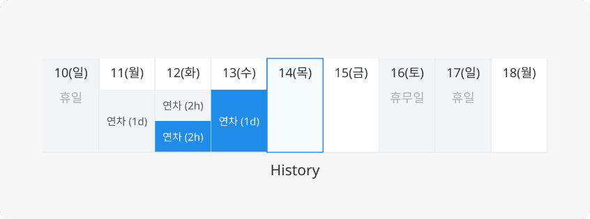 사용자가 휴가 신청 내역을 확인할 때 도움을 주는 형태입니다. Inactive, Active 상태에 따라 휴가의 사용 여부를 직관적으로 파악하도록 돕습니다.