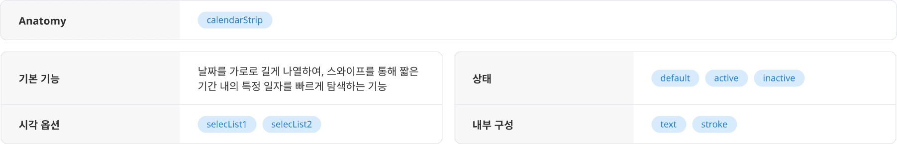 날짜를 한 줄로 나열해 간단하게 확인하거나 선택할 수 있는 캘린더 컴포넌트입니다.