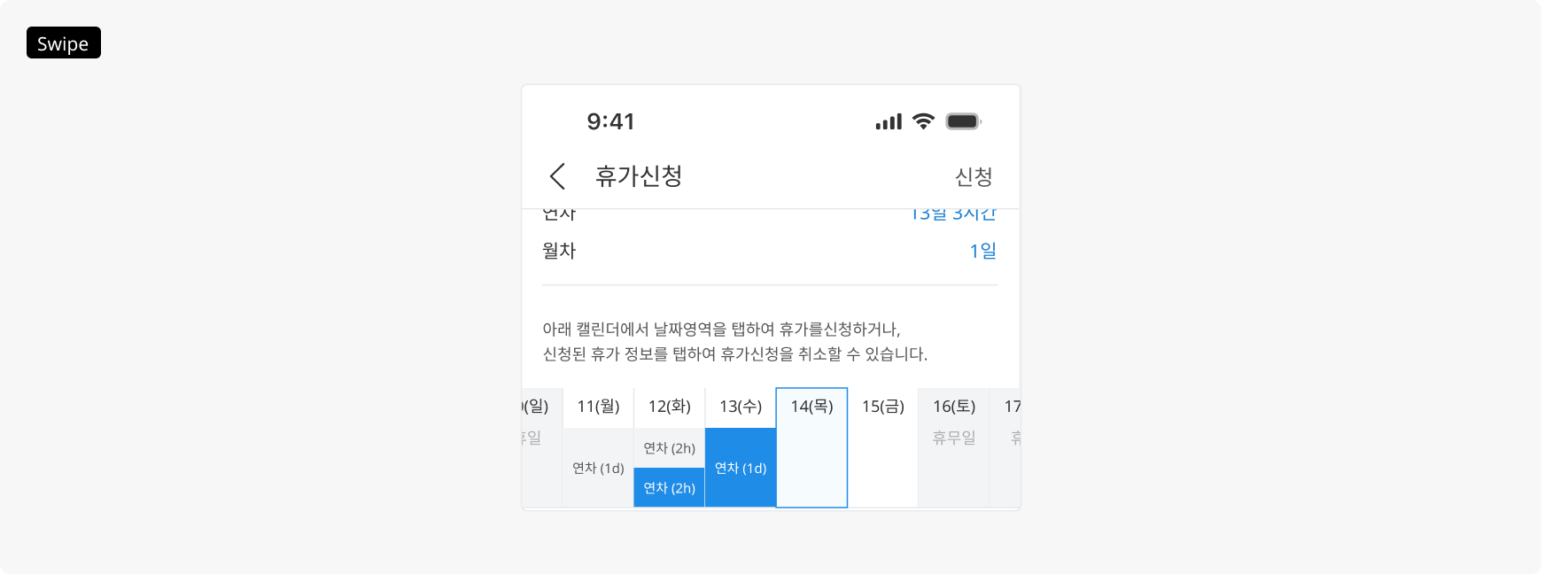 직접 탭하여 현재 신청한 휴가 및 일정을 확인할 수 있습니다.