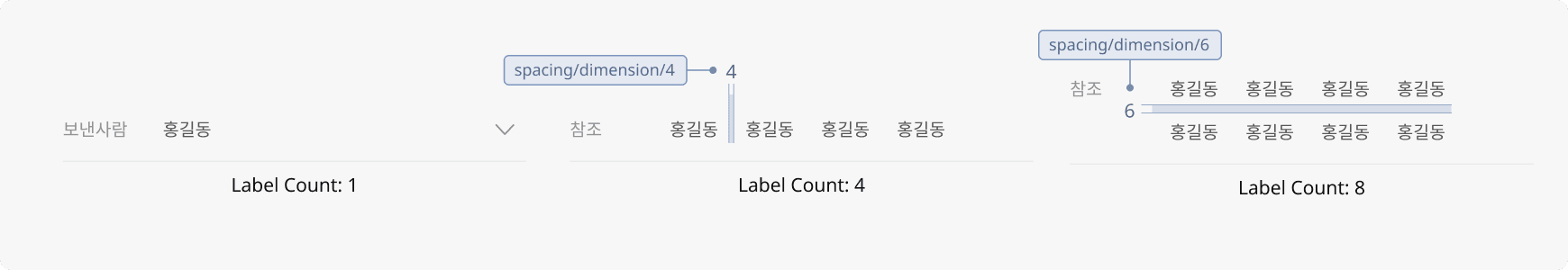 라벨이 포함된 영역의 높이값은 가변적이며, 가로 4px 세로 6px의 간격으로 라벨이 나열됩니다.