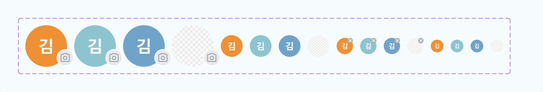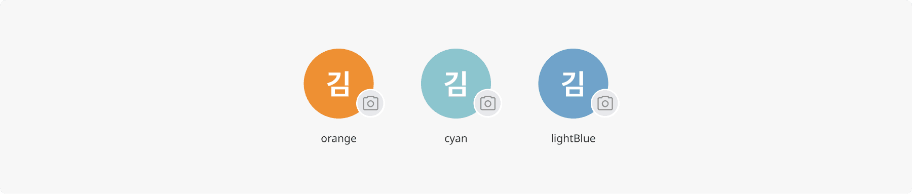 등록된 이미지가 없을 때 사용자의 이름(이니셜)이 표시되는 기본 타입입니다. 시각적인 구분을 위해 Orange, Cyan, LightBlue 총 3가지 바탕색(Color) 베리언트를 제공합니다.