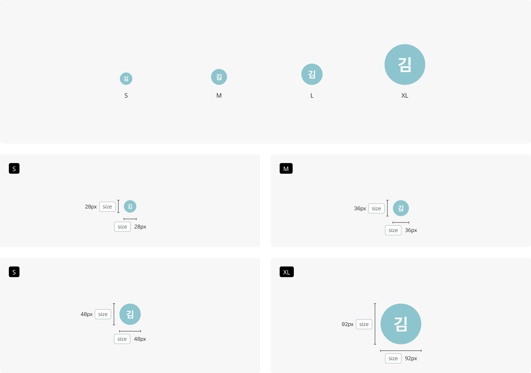 Avatar의 사이즈는 화면 위계와 목적에 따라 S, M, L, XL로 총 4가지 사이즈로 제공됩니다.