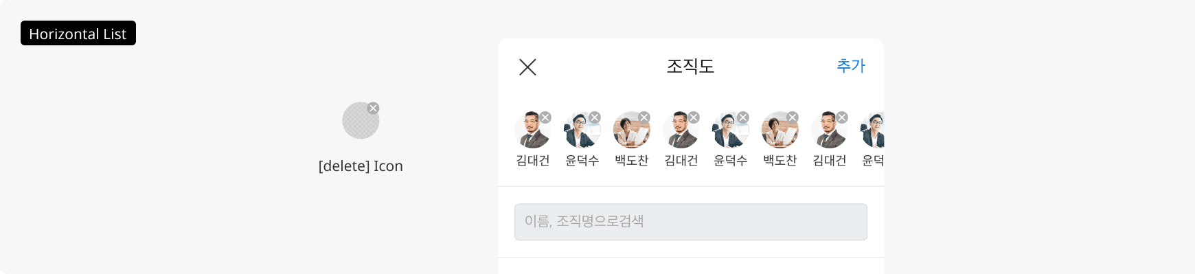 조직도나 수신자 목록에서 추가된 사람들을 가로로 나열할 때 사용합니다. 우측 상단에 삭제 아이콘을 활성화해 목록에서 즉시 제외할 수 있습니다.