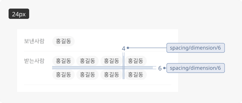 라벨이 반복될 때, 가로로 4px, 세로는 6px의 간격을 두고 사용합니다.