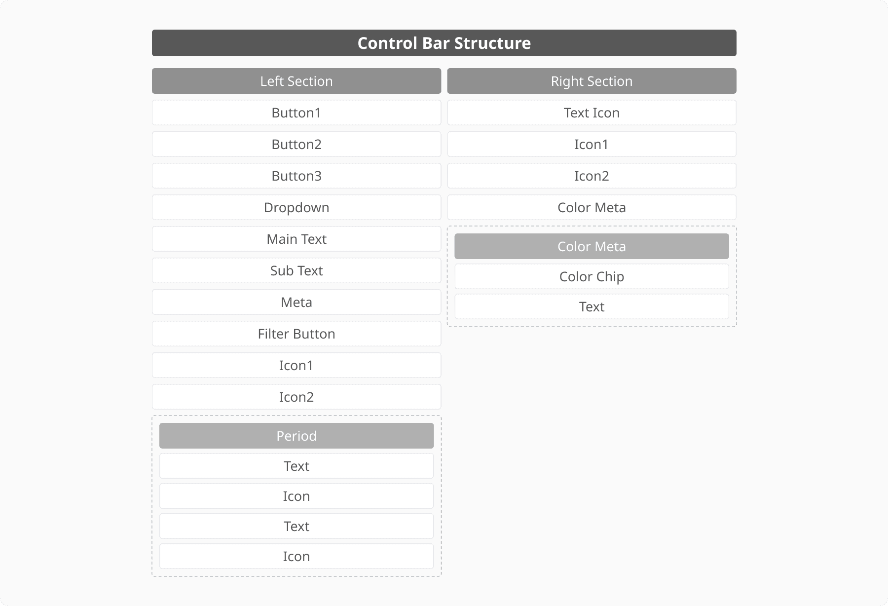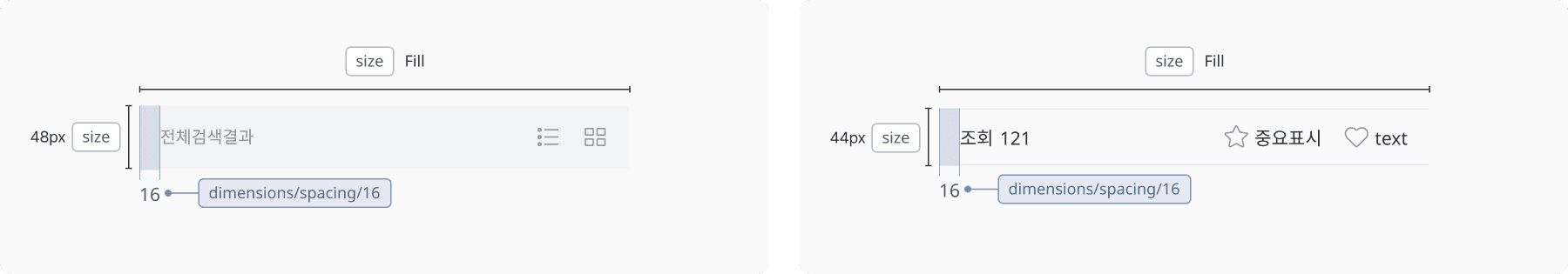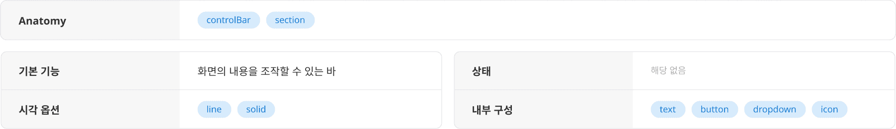 모든 Control Bar는 화면 너비에 맞춰 Fill로 설정되며, Solid는 48px, Line은 44px 높이로 사용됩니다.