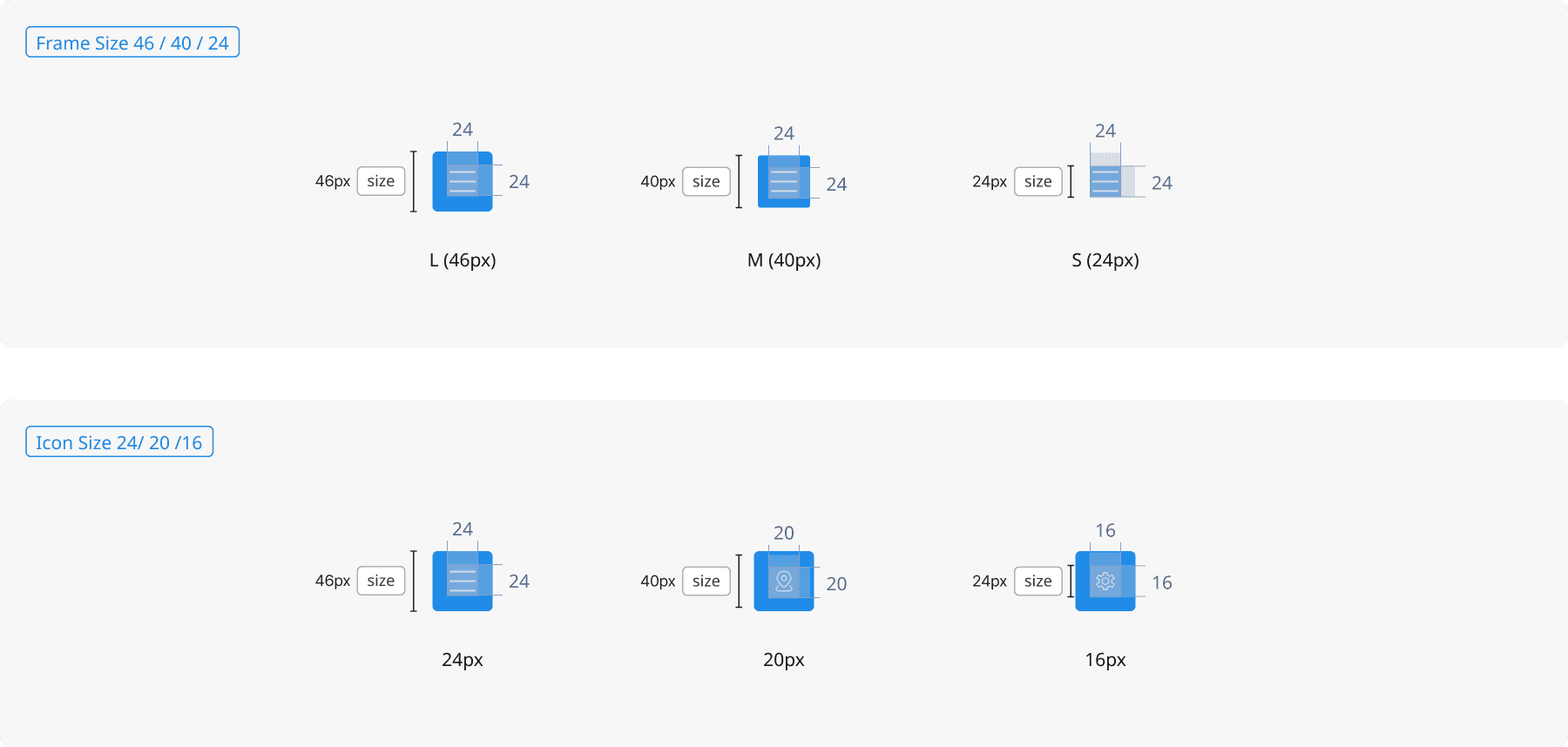 Icon Button 크기는 L, M, S 로 제공되며, 내부 Icon Set의 크기는 24, 20, 16px을 제공합니다