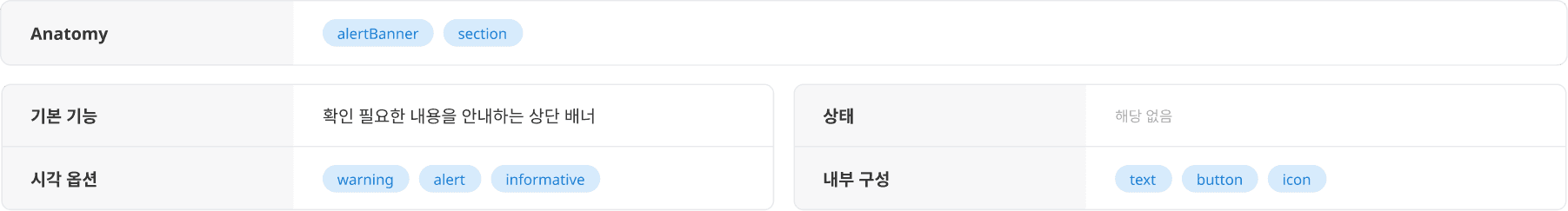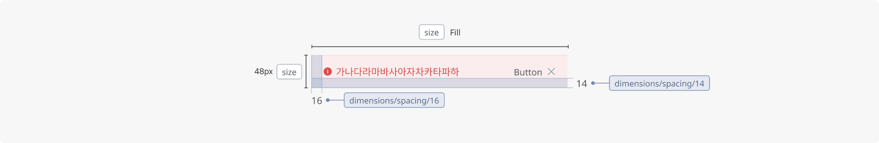 모든 Alert Banner는 화면 너비에 맞춰 Fill로 설정되며, 높이는 48px로 고정됩니다.