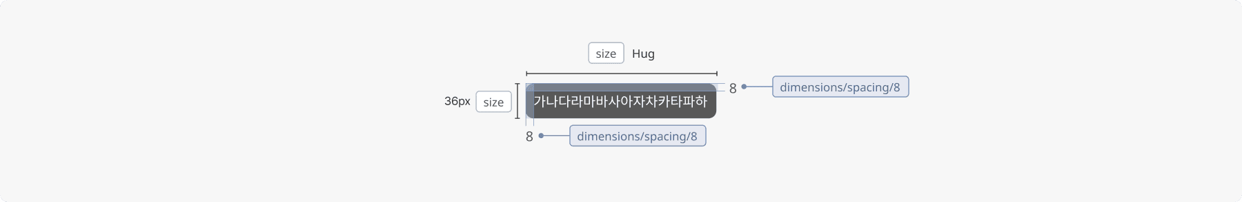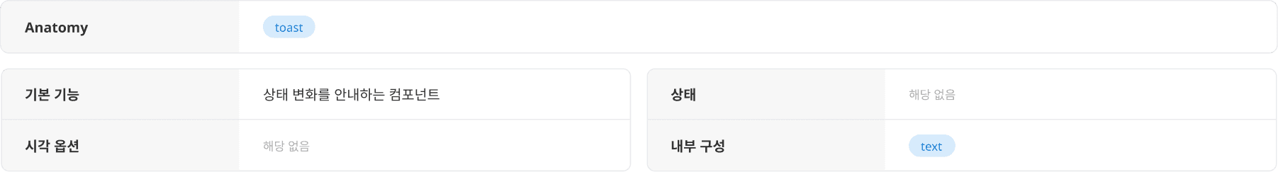 모든 Toast는 높이 36px로 고정되며, 너비는 내부 텍스트 길이에 따라 유동적으로 조정됩니다.