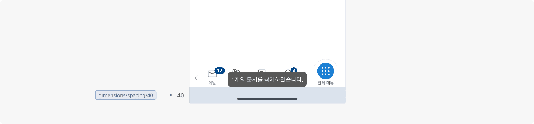 하단 네비게이션 위에 배치되어 함께 사용됩니다. 하단에서 40px 간격을 두고 띄워 배치합니다.