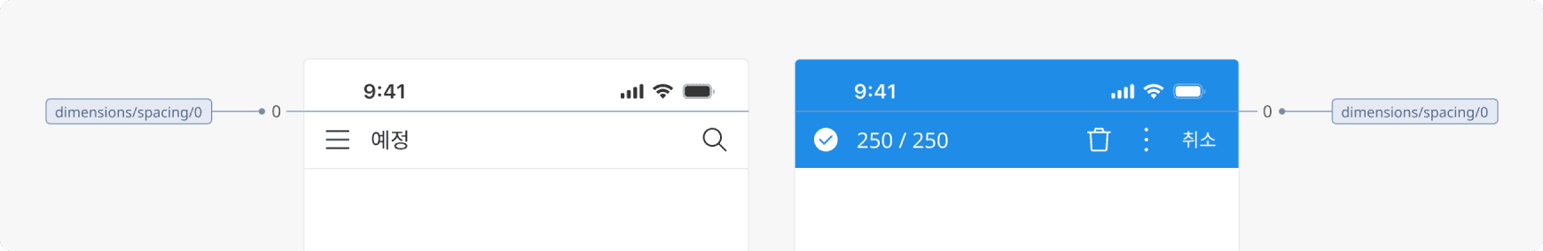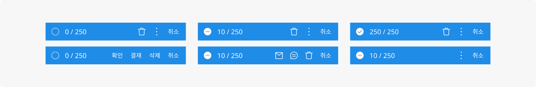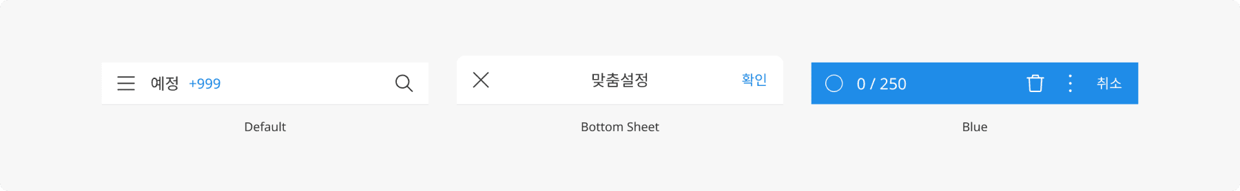 대부분의 화면에 사용되는 Default 헤더, 하단에 올라오는 Bottom Sheet 헤더, 파란 배경으로 편집 모드에서만 사용되는 blue가 있습니다.