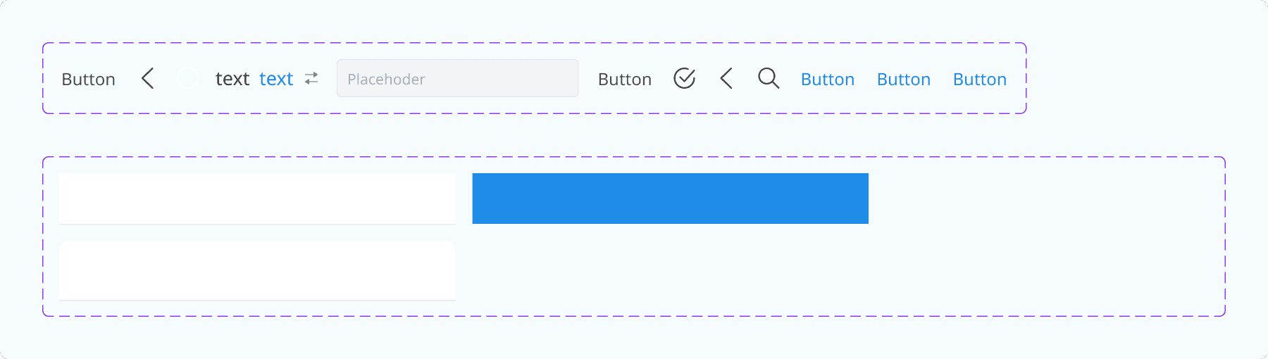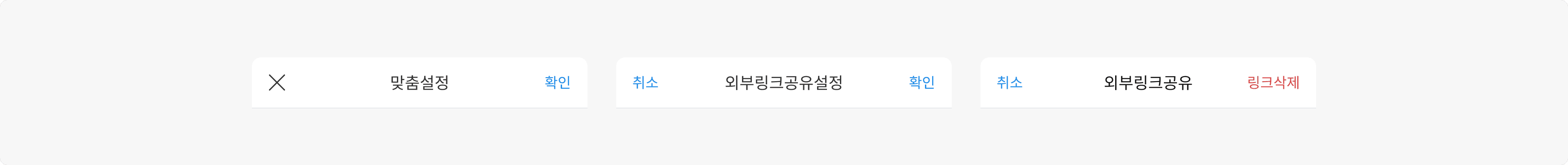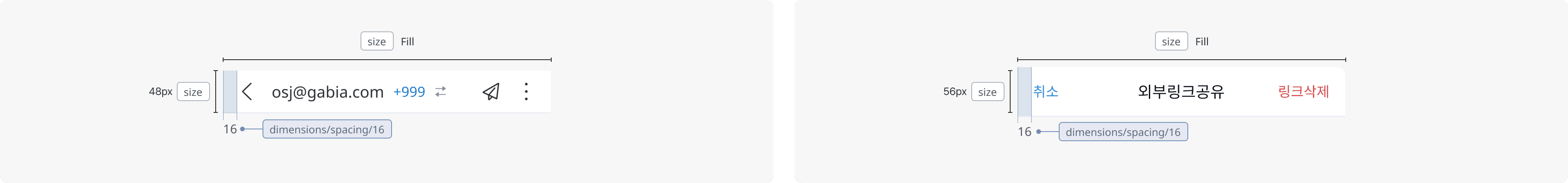 화면의 상단에서 현재 페이지의 제목과 핵심 정보를 전달하는 영역입니다. 필요에 따라 뒤로가기, 닫기, 검색, 액션 버튼 등 주요 기능을 함께 배치할 수 있습니다.