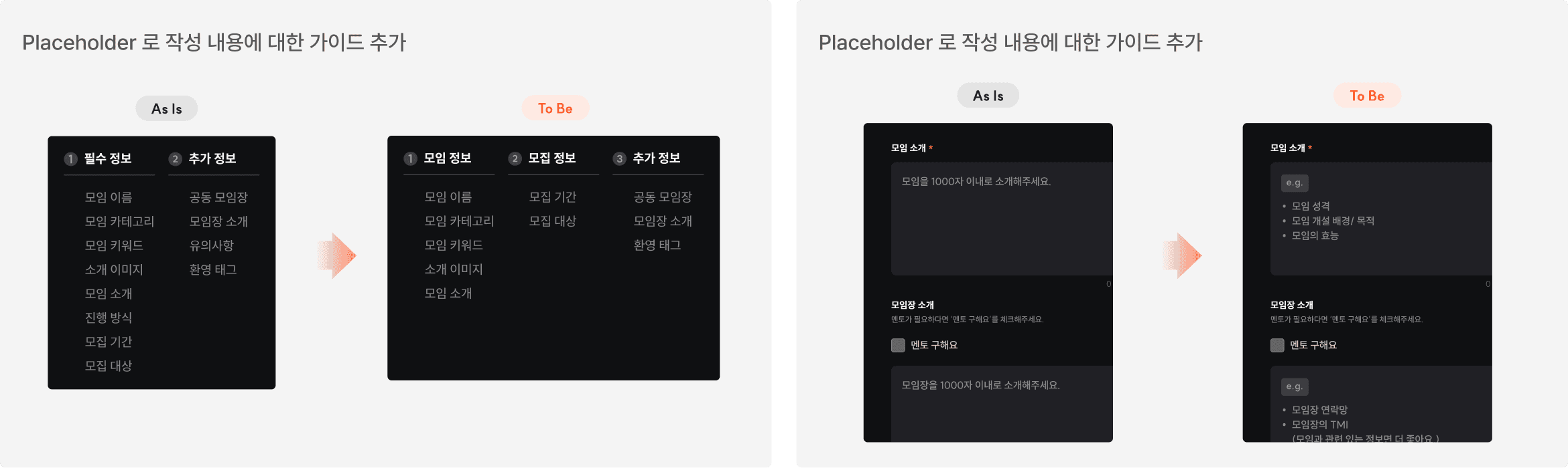 그래서 작성 항목을 줄이고 재그룹화했으며, Placeholder에 주관식 항목 가이드를 추가했습니다.