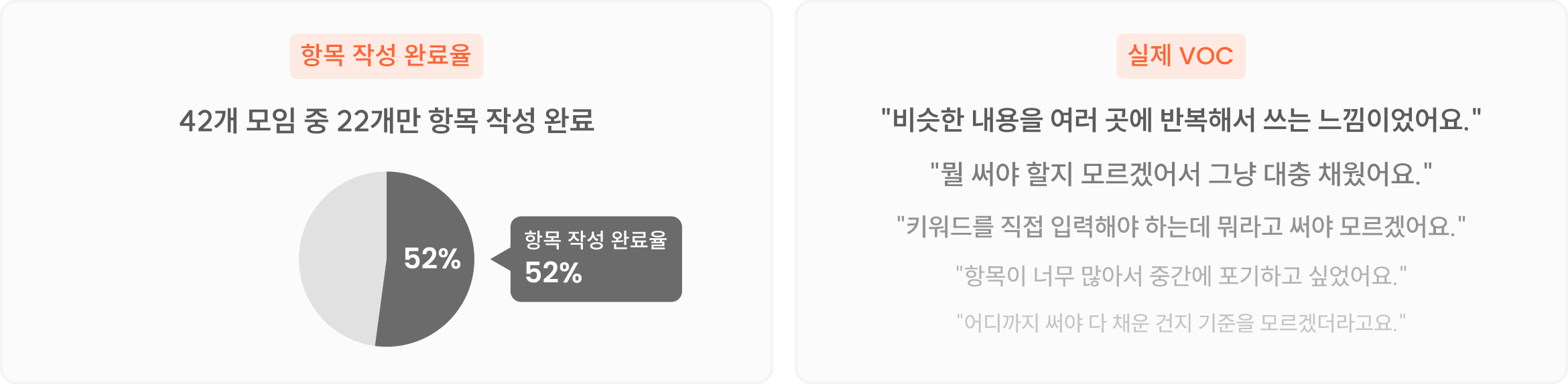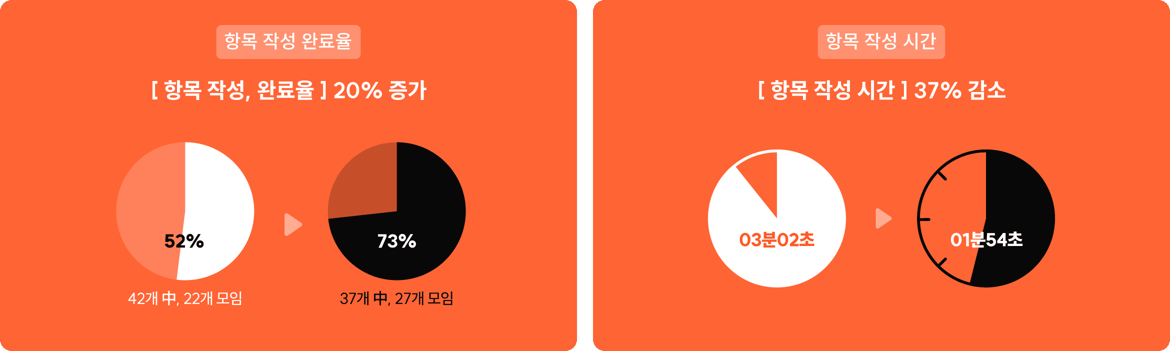 수정 후 항목 작성 시간을 37% 단축하고, 작성 완료율을 20% 향상시켰습니다.